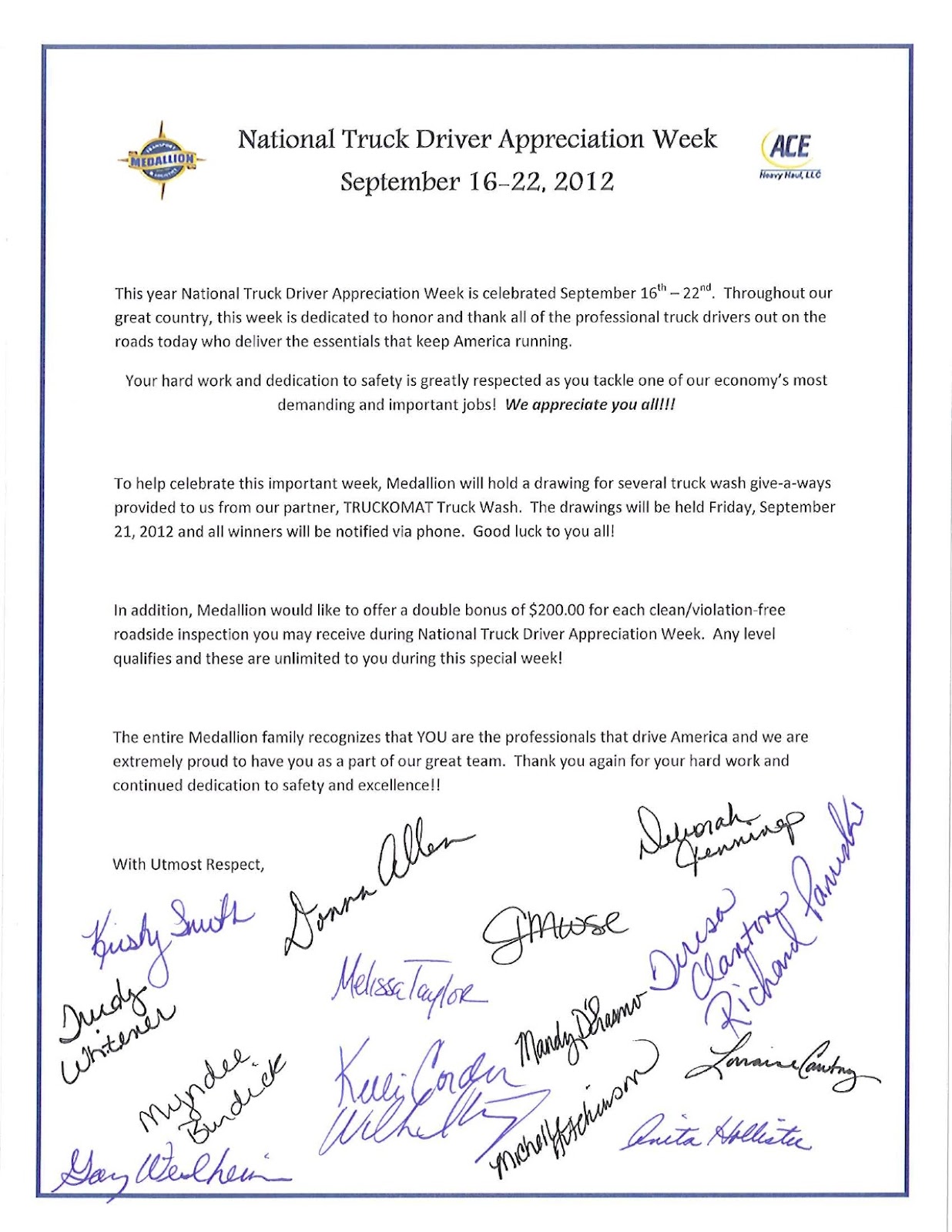 The entire Medallion family recognizes that YOU are the professionals that drive America and we areextremely proud to have you as a part of our great team. Thank you again for your hard work and continued dedication to safety and excellence!!